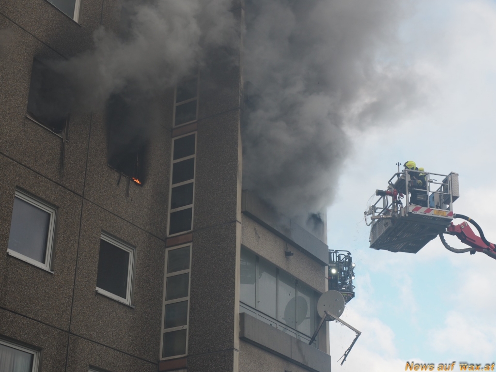 Im dritten Stock eines Mehrparteienwohnhauses war es aus noch unbekannter Ursache zu einem ausgedehnten Wohnungsbrand gekommen. Bei Eintreffen der Einsatzkräfte schlugen bereits meterhohe Flammen aus den Fenstern und dem Balkon der Wohnung. Zu diesem Zeitpunkt drohte der Brand bereits auf darüberliegende Wohnungen und die Fassade überzugreifen.