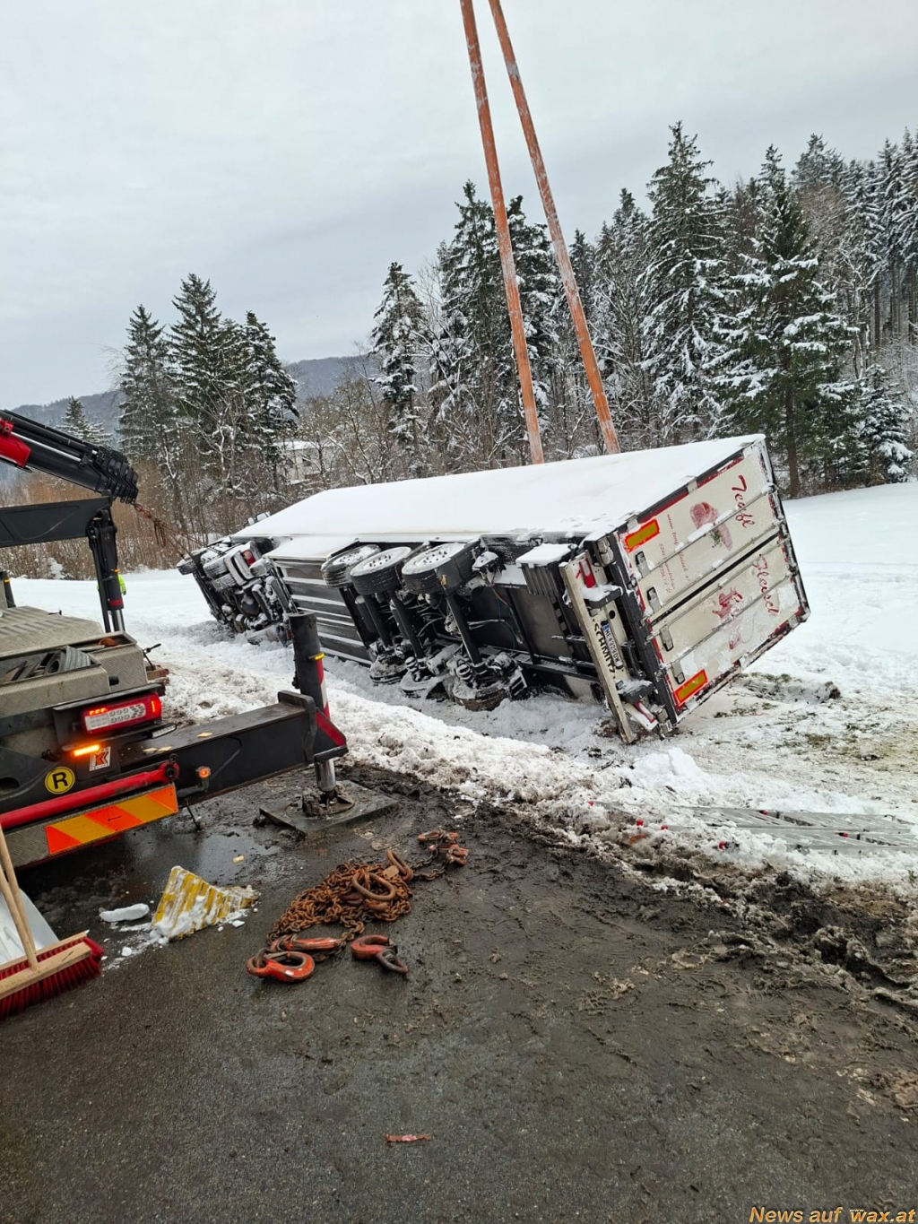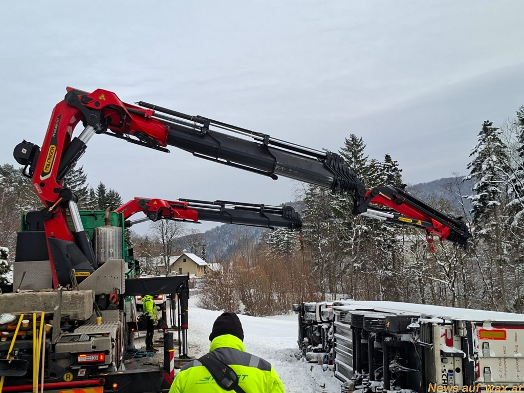 Der starke Schneefall sorgte für schwierige Fahrverhältnisse und führte in den frühen Morgenstunden zu einem Lkw-Unfall auf der B18. Ein mit Fleisch beladener Sattelzug kam von der Fahrbahn ab und kippte seitlich um. Der Lenker blieb bei dem Unfall unverletzt, war jedoch nicht in der Lage, das Fahrzeug eigenständig zu verlassen oder einen Notruf abzusetzen. Erst rund 20 Minuten nach dem Unfall, der sich gegen 5 Uhr in der Früh ereignet hatte, setzte ein Ersthelfer die Rettungskette in Gang.