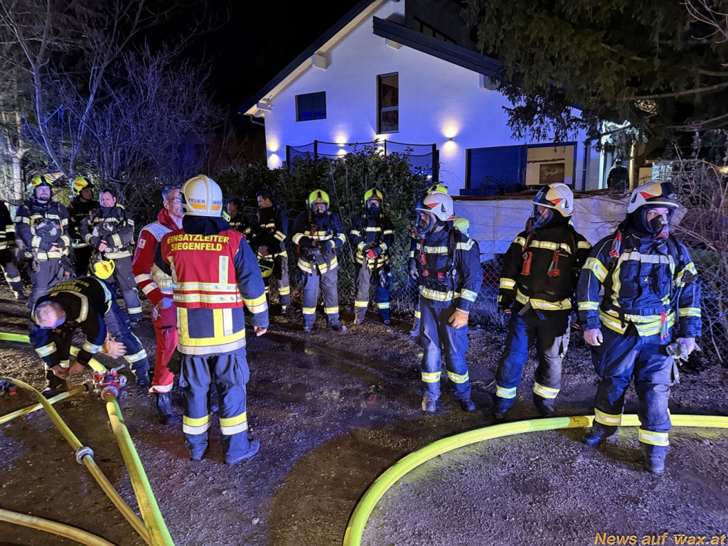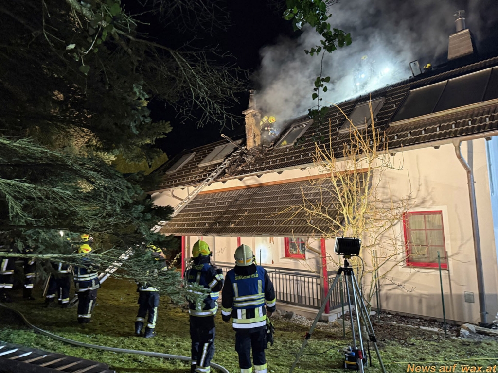 Vor dem Eintreffen der Feuerwehr konnten sich die Familie ins Freie retten. Straßenseitig war das Gebäude in Rauch eingehüllt und auf der Hausrückseite konnten Flammen wahrgenommen werden. Als Erstmaßnahme ließ der Feuerwehreinsatzleiter Kommandant Roland Wagenhofer (FF Siegenfeld) einen Löschangriff über den Außenbereich des Gartens vorgenommen. Ein zweiter Löschangriff wurde unter Atemschutz über das Stiegenhaus in das Dachgeschoß durchgeführt und über die in Stellung gebrachte Drehleiter startete ein weiterer Löschangriff von der Straßenseite des Hauses. Über die Gartenseite konnten die meterhohen Flammen im Außenbereich einmal im Bereich des Kamins niedergeschlagen werden.