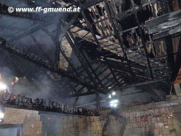 Räumung des Heustocks aus dem Dachbereich des Brandobjektes.