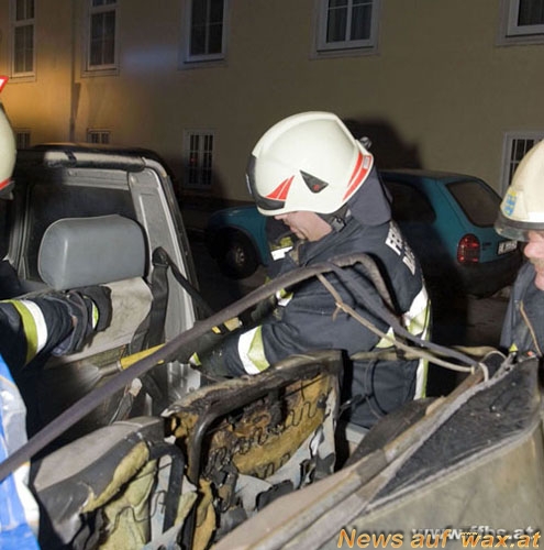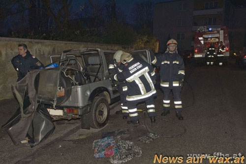 Laut Aussagen eines Anwohners in der Trostgasse, die sich in unmittelbarer Nähe des Stadtzentrums befindet, war gegen ca. 07:00 Uhr plötzlich ein extrem lauter Knall zu hören. Dieser dachte zwar zuerst an einen nachträglich explodierenden Silvesterböller und ging aufgrund der Lautstärke auf die Straße, um nachzusehen. Dabei stellte er fest, dass bei einem vor dem Haus geparkten Pkw-Geländefahrzeug mit Kennzeichen aus dem Bezirk Baden das Stoffdach samt Gestell vom Fahrzeug nach hinten weggerissen war und im Bereich der hinteren Sitzbank Rauch aufstieg. Weiter war bei dem Fahrzeug die Front-Windschutzscheibe gebrochen. Daraufhin verständigte der Anwohner über Notruf 122 die Feuerwehr und begann die Brandbekämpfung mit einem Handfeuerlöscher.