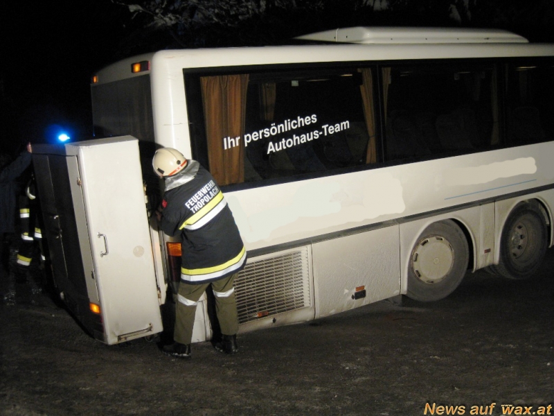 Die um ca. 20.00 Uhr telefonisch alarmierte Feuerwehr Tröpolach rückte mit zwei Fahrzeugen und neun Mann an, um das Fahrzeug aus seiner misslichen Lage zu befreien. Nachdem der Heckkasten entfernt wurde, konnte der Bus mit einem Stahlseil und dem Löschfahrzeug der Feuerwehr zurückgezogen werden. Schließlich musste der Lenker rückwärts ca. einen Kilometer die Bergstraße zurückfahren, um den Bus wenden zu können. Auch dabei wurde er von den Einsatzkräften durch Lotsen unterstützt. Nach rund zwei Stunden konnte der Einsatz abgeschlossen werden.