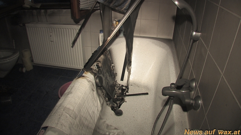 stellte einen Brand im Badezimmer fest, vermutlich ausgelöst durch eine
