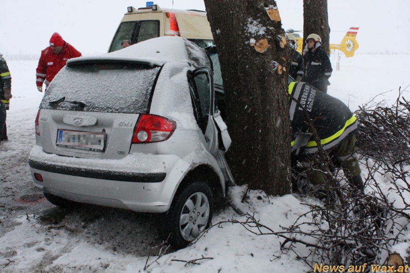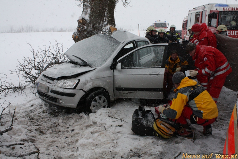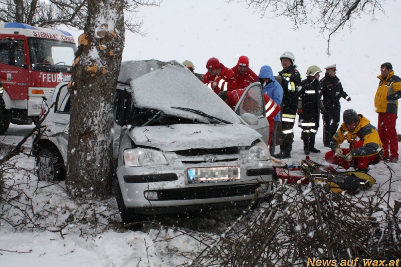 Ein schwerer Verkehrsunfall mit einer eingeklemmten Person ereignete sich am Sonntag, 17. Jänner 2010, gegen 14.40 Uhr auf der Straße zwischen Zarnsdorf und Wieselburg. Eine PKW-Lenkerin war auf Schneefahrbahn mit ihrem Fahrzeug von der Straße abgekommen und gegen einen Baum geprallt.