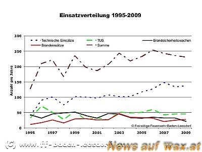 Mit 231 Einsätzen erreichte die Freiwillige Feuerwehr Baden-Leesdorf im Jahr 2009 wieder eine der Höchstwert der letzen Jahre. Zum Glück blieben die tatsächlichen Brandeinsätzen weiterhin gering. Die Anzahl der technischen Einsätze war mit 137 Einsätzen fast fünfmal so hoch als die der Brandeinsätze.