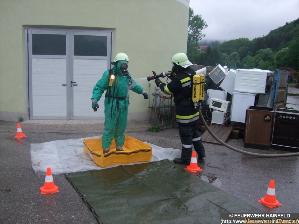 Übungsanahme war ein Brand am Altstoffsammelzentrum Hainfeld, ausgelöst durch illegal abgelagerte Problemstoffe. In weiterer Folge kam es im Sammelzentrum für Schadstoffe zu einem Austritt einer ätzenden Flüssigkeit. Durch Atemschutztrupps der diversen Feuerwehren wurde in den betroffenen Räumen eine Menschenrettung sowie ein Löschangriff vorgenommen. Ein weiterer Trupp rüstete sich mit Chemikalienschutzanzügen aus und begann mit der Bergung der umgestürzten Fässer mit Schadstoff. Nach Beendigung dieser Aufgabe erfolgte eine fachgerechte Dekontamination der eingesetzten Chemikalienschutzanzugträger. Als weitere Sicherheitsmaßnahme wurde im Verlauf der Übung auch die Chemikalien-/Ölsperre der Feuerwehr Hainfeld auf der Gölsen in Stellung gebracht. Ein Atemschutznotfall, bei dem es einen verunfallten Feuerwehrkameraden zu retten gab, rundete diese anspruchsvolle Übung ab.