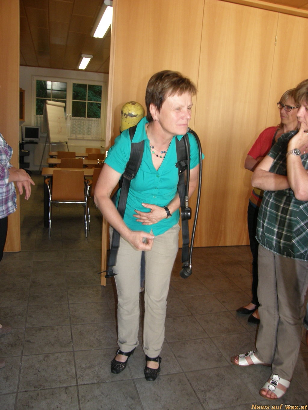 Dabei konnte ausprobiert werden wie Einsatzkräfte sich mit den beiden Stahlflaschen am Rücken und mit eingeschränkter Sicht in unbekannten Räumen fortbewegen müssen.