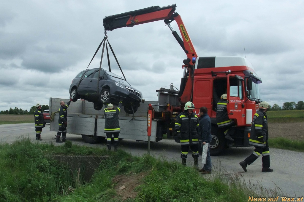 Mittels Bergeseilwinde des Schweren Rüstfahrzeuges und dem Kran des Lastfahrzeuges wurde zuerst der Fiat Ducato Maxi aus dem Graben gezogen und am Begleitweg abgestellt. Der Abtansport des Kleintransporters erfolgte durch ein privates Abschleppunternehmen. Der Opel Zafira wurde anschließend mittels Kran auf unser Lastfahrzeug verladen und von der Einsatzstelle abtransportiert.