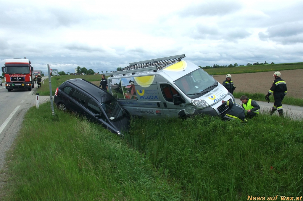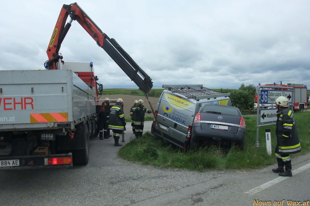 Ein Lenker aus Waidhofen war mit seinem Opel Zafira von Waidhofen kommend Richtung Thaya auf der LB36 unterwegs. Höhe des Fernheizwerkes wollte er links in einen Begleitweg einbiegen. Ein hinter ihm fahrender Dobersberger dürfte den vor ihm abbiegenden PKW zu spät bemerkt haben und krachte mit seinem Fiat Ducato Maxi in die linke Seitenwand des Opel. Dabei wurden beide Fahrzeuge in den linken Straßengraben geschleudert und kamen dort schwer beschädigt zum Stillstand. Alle Insassen der beiden Fahrzeuge blieben bei diesem Unfall glücklicherweise unverletzt.