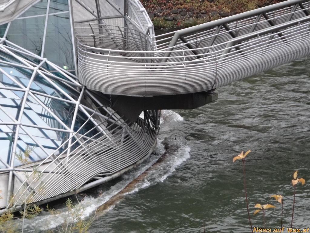 Im Bereich der Murinsel ist eine Verklausung mit einem sehr großen angeschwemmten Baumstamm von ca. 10 Meter Länge aufgetreten, wobei der Baum sich vor der Spitze der Murinsel quer zur Strömungsrichtung verfangen hat. Dadurch wurde ein sehr starker Strömungswiderstand aufgebaut, der zu einer starken Belastung der Trageseile führte. Weiters hat sich ein kleinerer Stamm auf der linken Seite der Insel in die Verkleidung gebohrt.