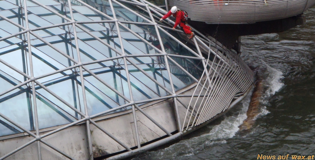 Die Berufsfeuerwehr Graz wurde heute (Freitag, 22. November 2013) über den oben beschriebenen Sachverhalt informiert und rückte daraufhin umgehend mit den entsprechenden Spezialisten der Höhenrettung und den dazugehörigen Gerätschaften zu diesem ungewöhnlichen Einsatzort aus und entfernte mit Hilfe der Motorsäge die Verklausung.