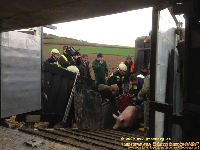 Am 25.11.2013 gegen 10:00 Uhr. Der Anhänger eines mit Mastschweinen beladenen LKW Zuges ist an einer Kreuzung bei Schallaburg umgestürzt. Die Feuerwehr und das beteiligte Transportunternehmen ist dabei die Tiere in einen Ersatz LKW um zu laden.