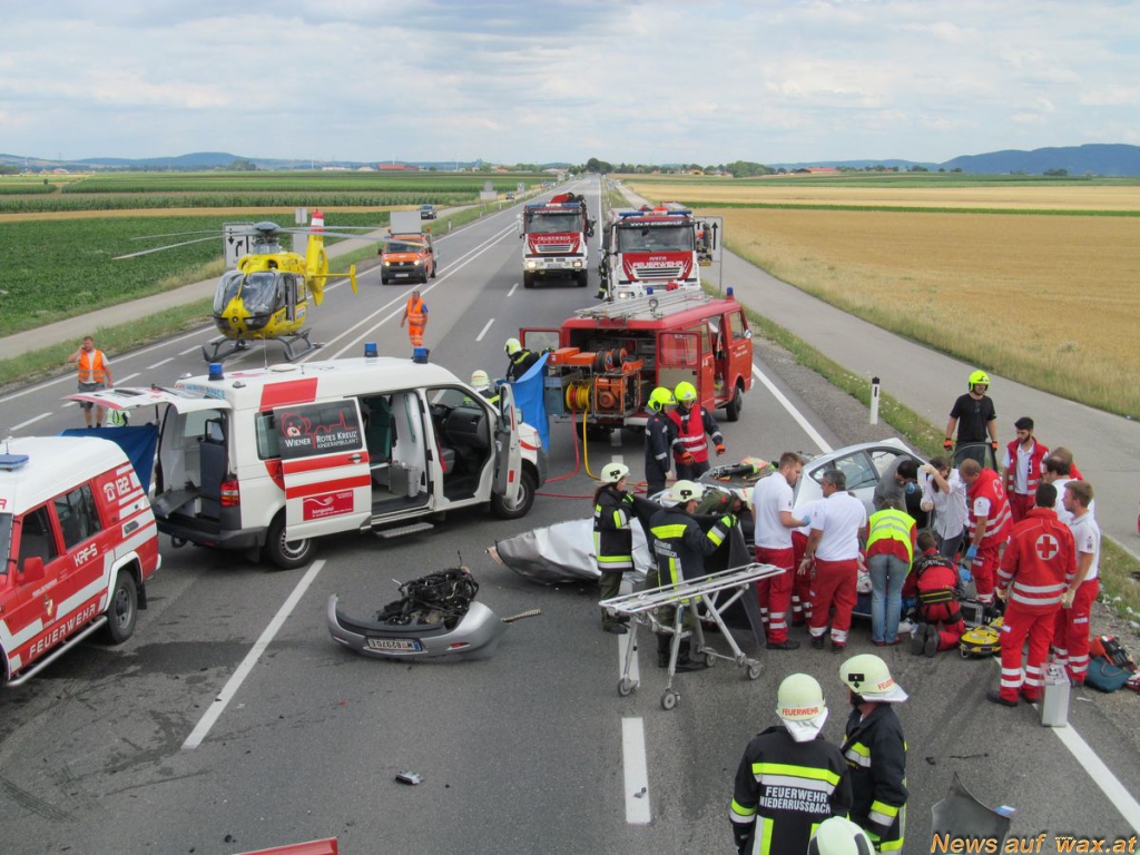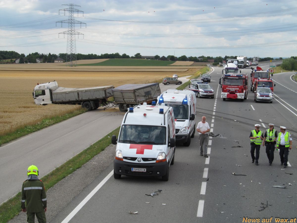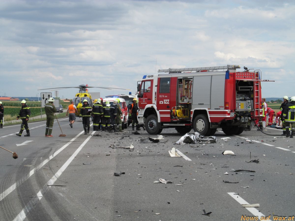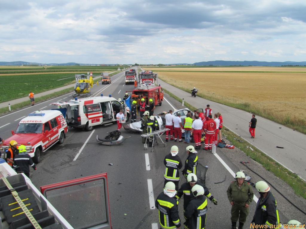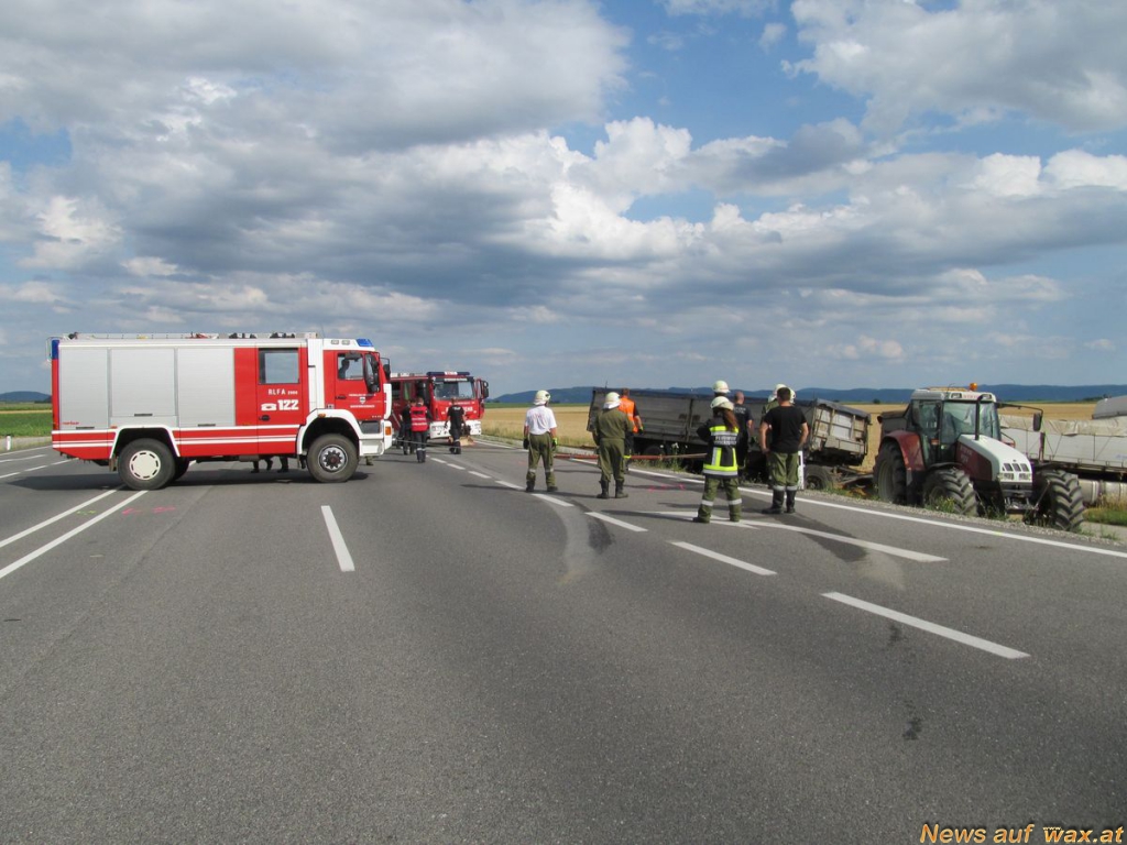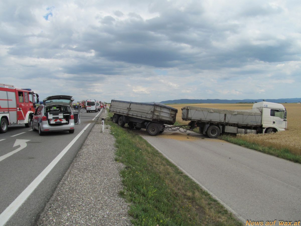 Ein älteres Ehepaar war mit ihrem Fahrzeug mit Wiener Kennzeichen in Richtung Wien aus ungeklärter Ursache von der Fahrbahn abgekommen und prallte gegen einen entgegenkommenden LKW mit Anhänger der vollbeladen mit Getreide war.