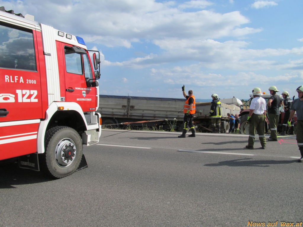 Im Anschluß wurde das Fahrzeug mittels Kran der FF-Niederrußbach geborgen und vom Einsatzort abtransportiert und gesichert abgestellt. In der Zwischenzeit wurde als Unterstützung für die Bergung des LKW, der ebenfalls von der Fahrbahn abgekommen ist, und die angrenzende Böschung hinuntergeschlittert ist, ein Traktor eines FF-Mitglieds angefordert, um bei der Bergung des Anhängers zu helfen.