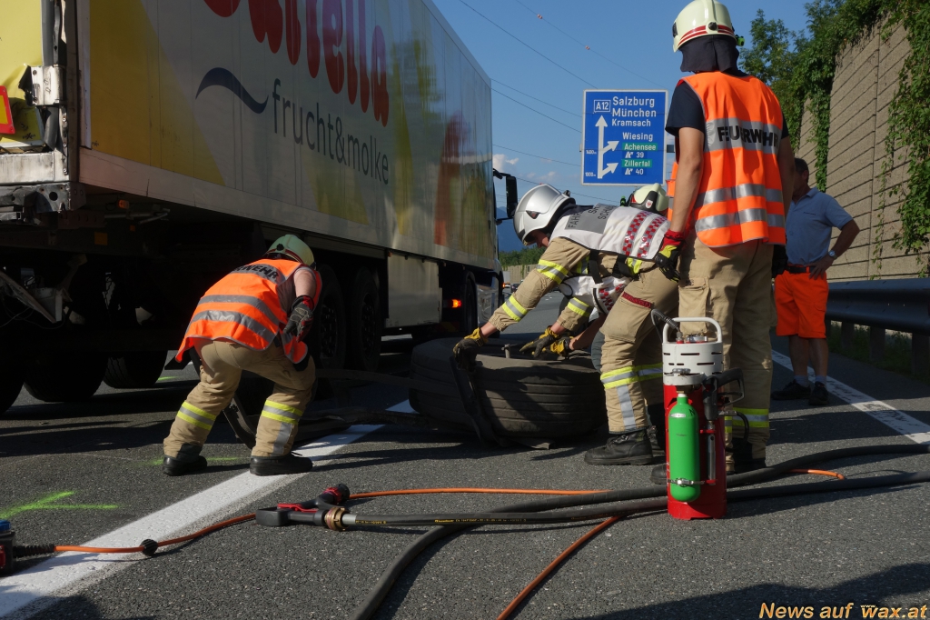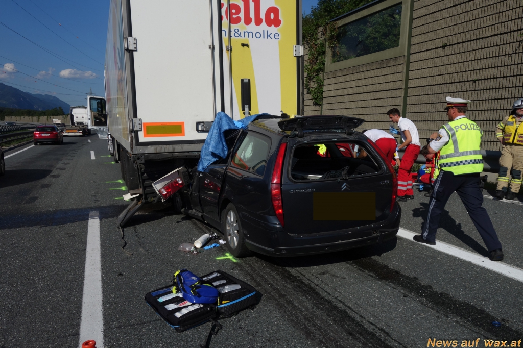 Der Unfall ereignete sich im Stauende eines vorangegangenen LKW Brandes zwischen Kramsach und Wiesing. Der PKW schob sich mit großer Wucht unter den LKW. Unmittelbar nach dem Unfall erreichte ein Krankentransportwagen des Rettungsdienstes die Unfallstelle, dieser setzte auch die Rettungskette in Gang. Neben dem Notarzt, einem RTW und dem Einsatzleiter Rettungsdienst wurde auch die Feuerwehr Schwaz alarmiert, um den Fahrer zu befreien. Obwohl sich das Auto bis zur B - Säule unter den LKW schob, konnte der Fahrzeuglenker bei seiner Befreiung durch das Rettungsdienstpersonal noch mithelfen. Die Aufgabe der Feuerwehr bestand darin, die Unfallstelle gemeinsam mit der Polizei abzusichern, den Brandschutz aufzubauen sowie bei der Versorgung des Verletzten zu helfen.