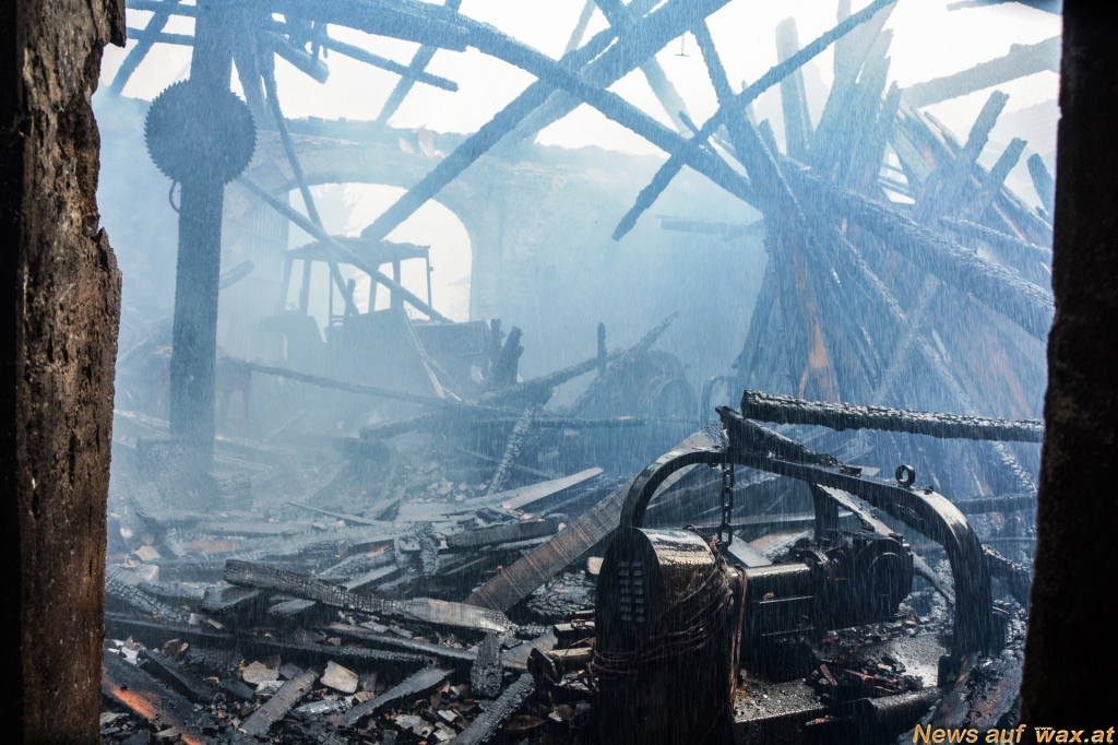 Die weiteren Feuerwehren übernahmen das Ablöschen der Scheune. Aufgrund der hohen Brandlast durch gelagertes Brennholz musste ein umfassender Löschangriff mit 6 Löschleitungen vorgenommen werden. Zwei Traktoren und die Scheune vielen dem Feuer zum Opfer.
