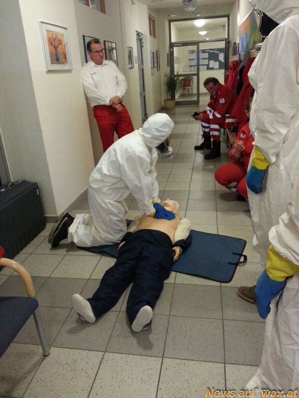 Weil unter ABC-Bedingungen auch die Erste-Hilfe-Leistung und der Abtransport von Verletzten notwendig sein kann, wurde auch eine solche Situation nachgestellt und unter vollen Schutzbedingungen (Schutzanzug und Masken) durchgeführt. Mitarbeiter der CBRN-Einsatzgruppe des RK-Landesverbandes Wien, beteiligten sich als Ausbildner und auch als Übungsteilnehmer. Bei dieser Schulung konnte die übende Mannschaft auch den Landesrettungskommandanten des OÖ Roten Kreuzes, Herrn Reinhard Schmidt MAS MSc, begrüßen.