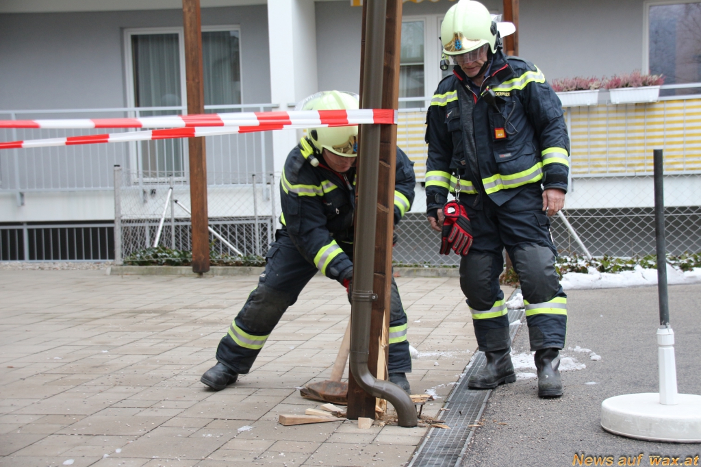 Vor dem Haupteingang in die Residenz wurde der äußerste Holzsteher der angebauten Pergola beschädigt. Nachdem der gefährdete Bereich durch das Unternehmen abgesperrt wurde, konnte durch einige Schläge, mit einem 10kg-Vorschlaghammer vom schweren Rüstfahrzeug, der Steher in die ursprüngliche Position zurückgebracht werden. Abschließend wurden weitere Sicherungsmaßnahmen an der Holzkonstruktion durchgeführt. Nach rund 30 Minuten war der Einsatz beendet und die zehn Mitglieder konnten mit deren zwei Fahrzeugen, unter der Leitung von BR Wolfgang Deringer, wieder ins Feuerwehrhaus einrücken.