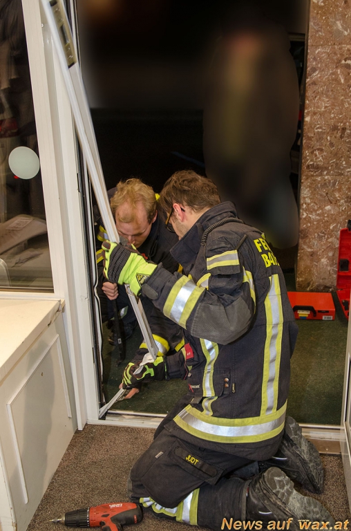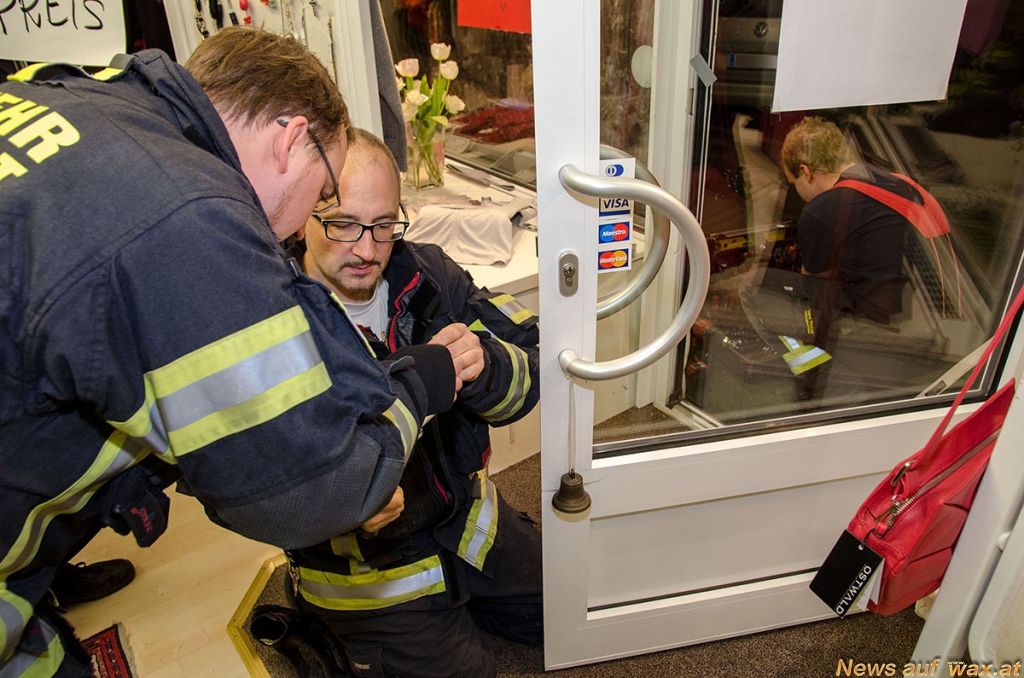 Die Feuerwehrleute mussten zuerst die stark verbogenen Rahmenteile entfernen, um anschließend davon wieder einige zugeschnittene Schließbleche zur provisorischen Sicherung im Türrahmen verankern zu können. Ebenso konnte das beschädigte Türschloss soweit wieder in Stand gesetzt werden, dass ein versperren der Geschäftseingangstüre wieder möglich war.