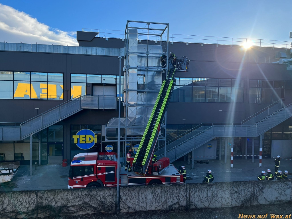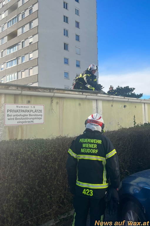 Mit Hilfe der Drehleiter sicherten die Einsatzkräfte abermals durch den Sturm losgerissene Bauteile einer Belüftungsanlage an der Fassade des SCS Multiplex in Wiener Neudorf. Parallel zu diesem Sturmeinsatz wurde die FF Wiener Neudorf auch zu einer Fahrzeugbergung auf die Südautobahn A2 gerufen.