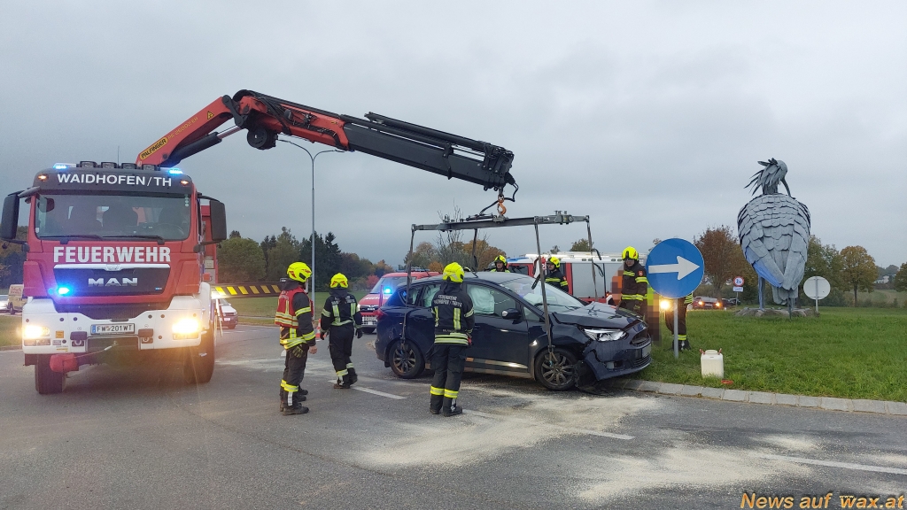 Während der Bergungsarbeiten musste der Verkehr aus Richtung Wien und Waidhofen kommend angehalten werden, damit sich das Wechselladefahrzeug zur PKW-Bergung im Kreisverkehr aufstellen konnte.