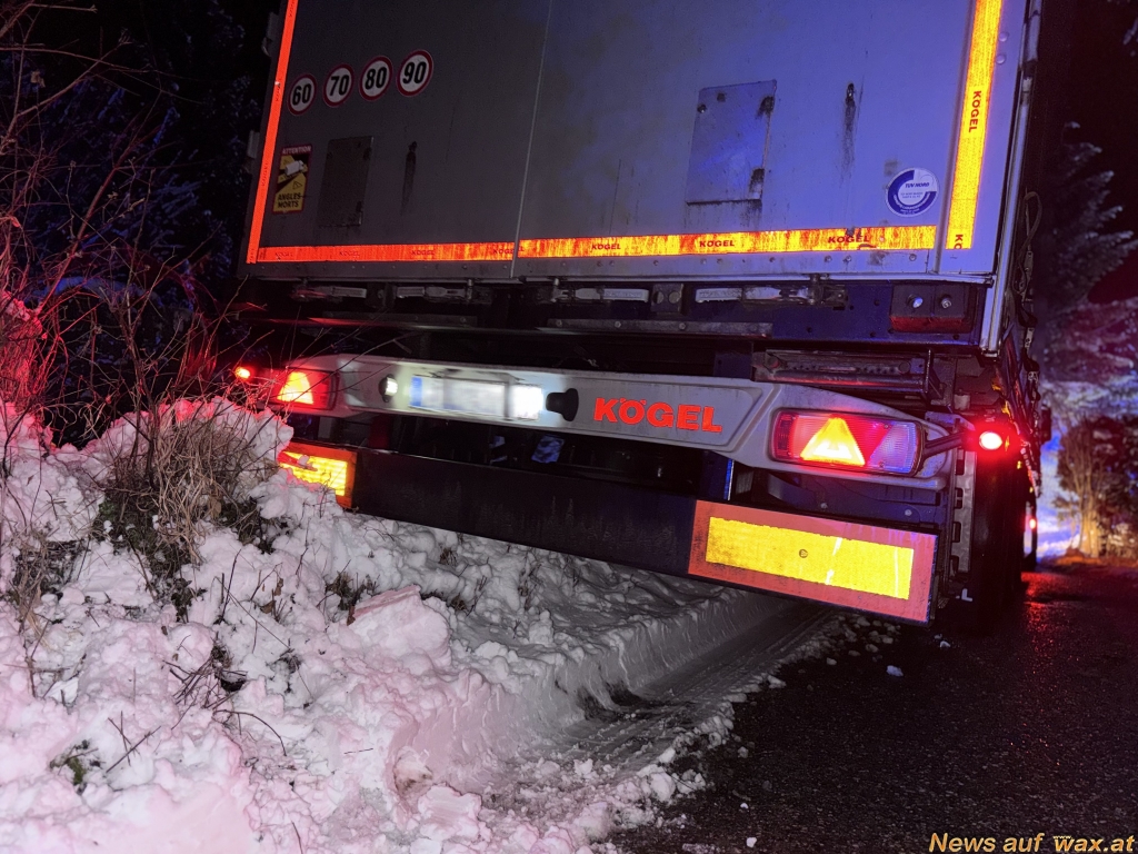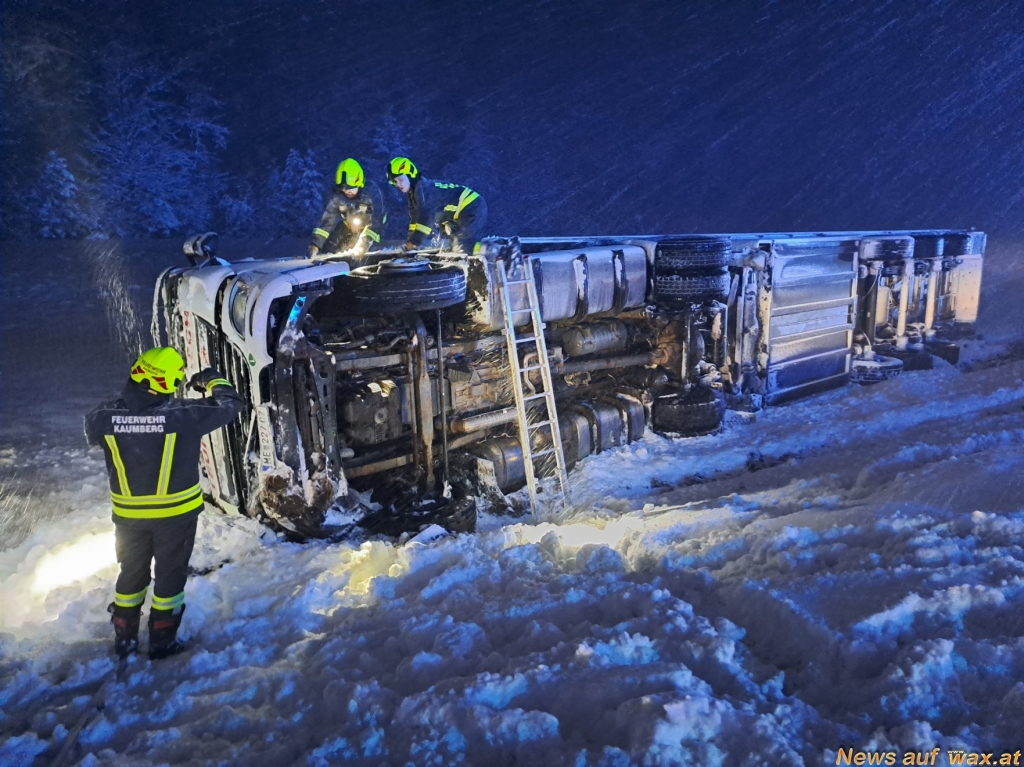 Der starke Schneefall sorgte für schwierige Fahrverhältnisse und führte in den frühen Morgenstunden zu einem Lkw-Unfall auf der B18. Ein mit Fleisch beladener Sattelzug kam von der Fahrbahn ab und kippte seitlich um. Der Lenker blieb bei dem Unfall unverletzt, war jedoch nicht in der Lage, das Fahrzeug eigenständig zu verlassen oder einen Notruf abzusetzen. Erst rund 20 Minuten nach dem Unfall, der sich gegen 5 Uhr in der Früh ereignet hatte, setzte ein Ersthelfer die Rettungskette in Gang.